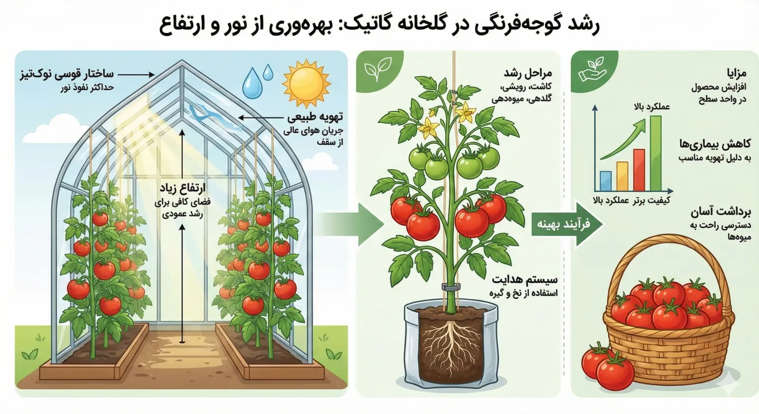 - کشت صیفیجات: محبوبترین کاربرد برای خیار، گوجه فرنگی، فلفل دلمهای و بادمجان است. ارتفاع بلند سازه اجازه میدهد بوتهها را تا ارتفاع ۴ یا ۵ متر بالا ببرید (High-wire growing) که عملکرد را چند برابر میکند.